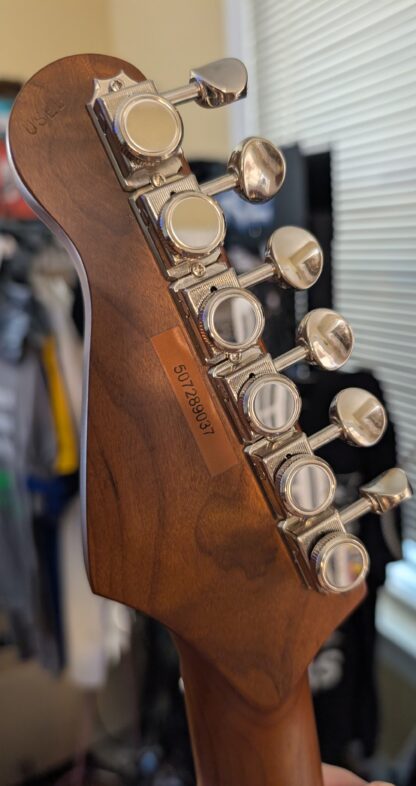 This is a new guitar but through an agreement with our supplier they have stamped the word USED in the back of the headstock. Deluxe Cerberus gig bag.