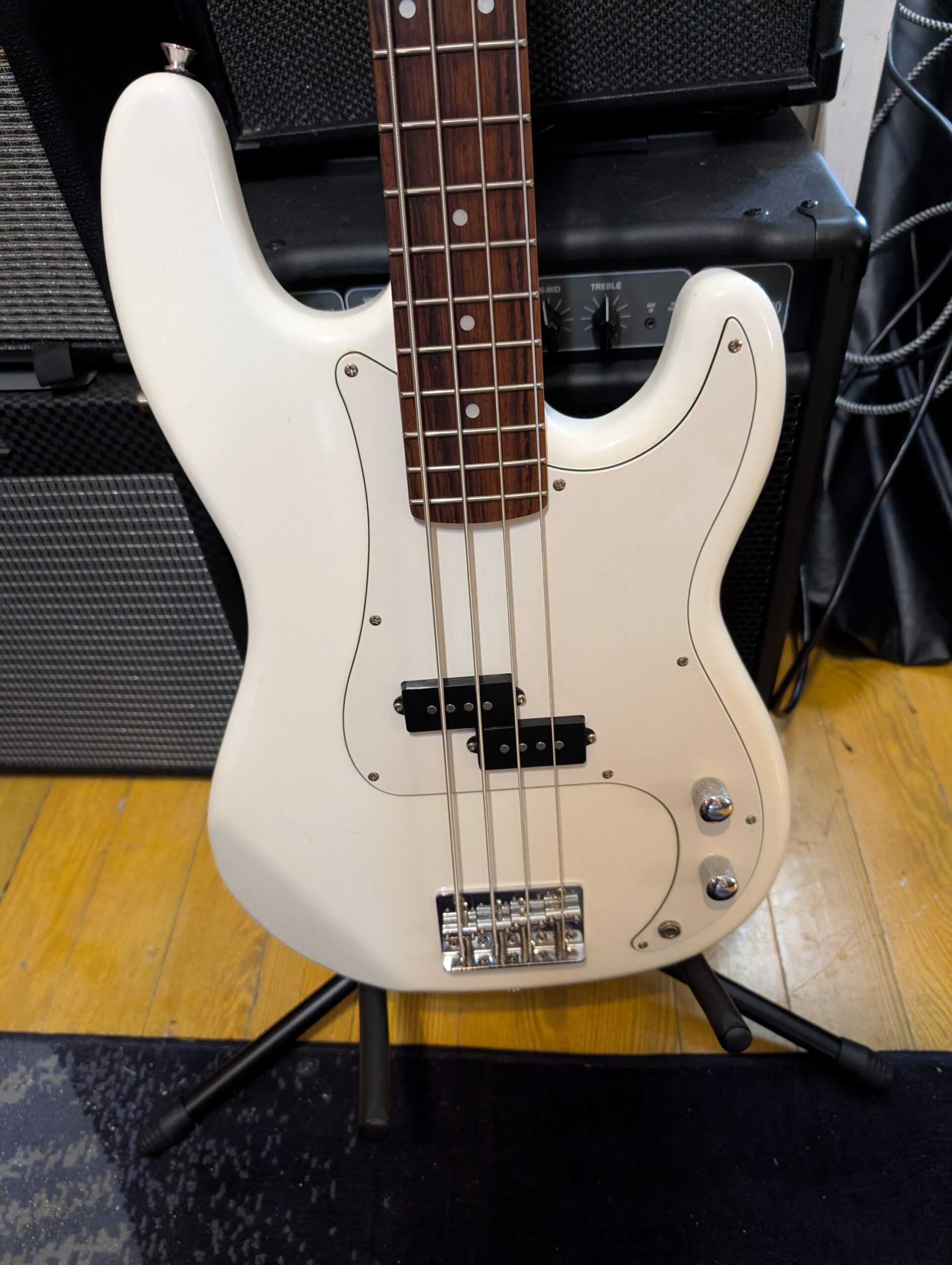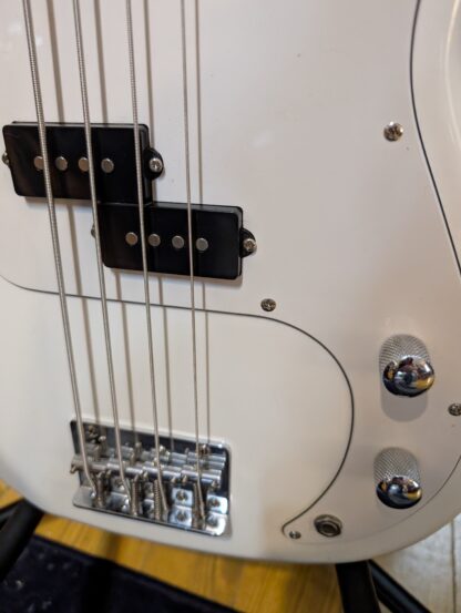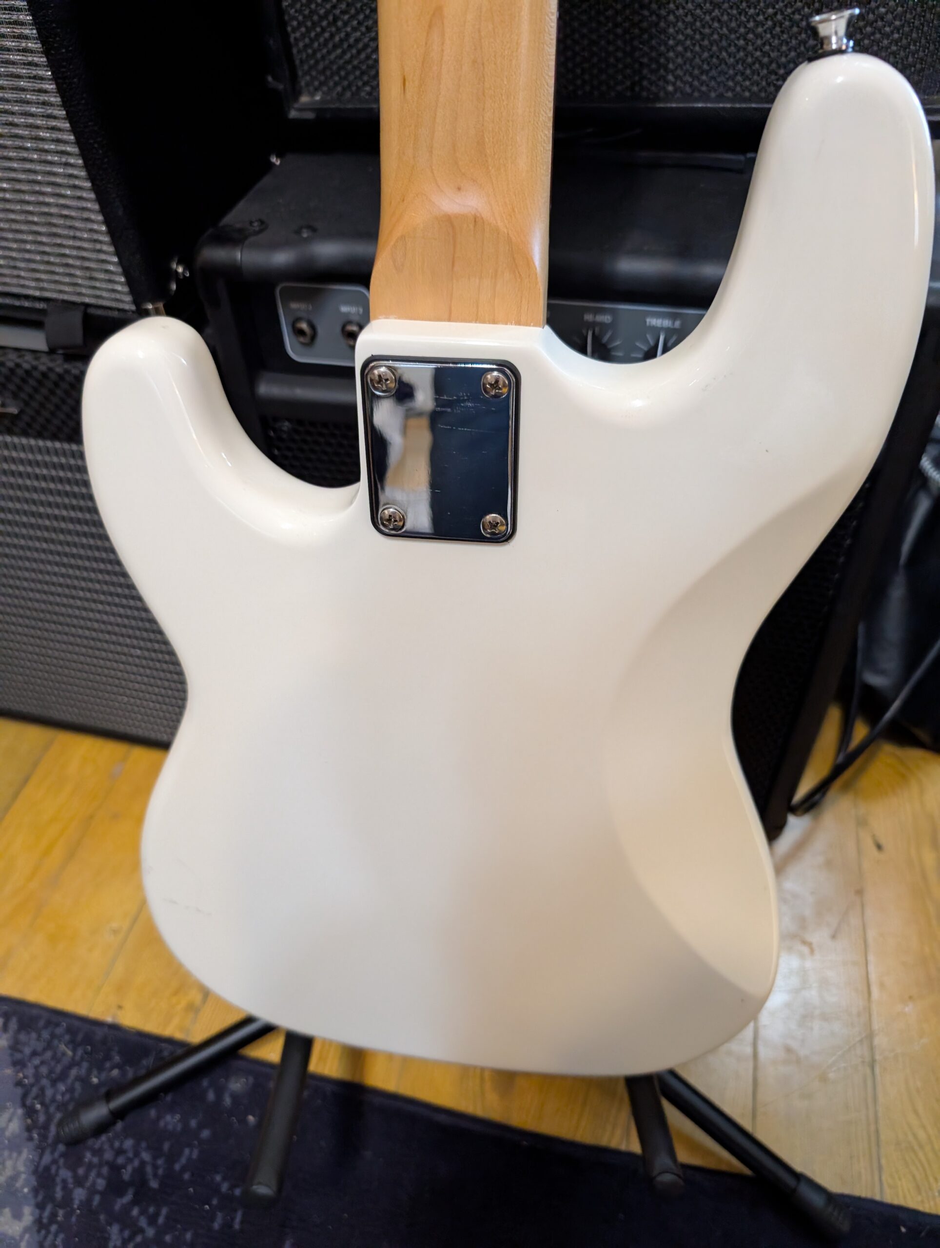 I happen to be married to “Johnny Corbin” who started the company with his partner in China in 2006. This bass is 2009 I believe. Beautiful white finish. We don’t import the electric Corbin guitars any more but still bring in Corbin Professional level Acoustic guitars which are superb. John has always been concerned primarily with quality and the builder is a family-run business.