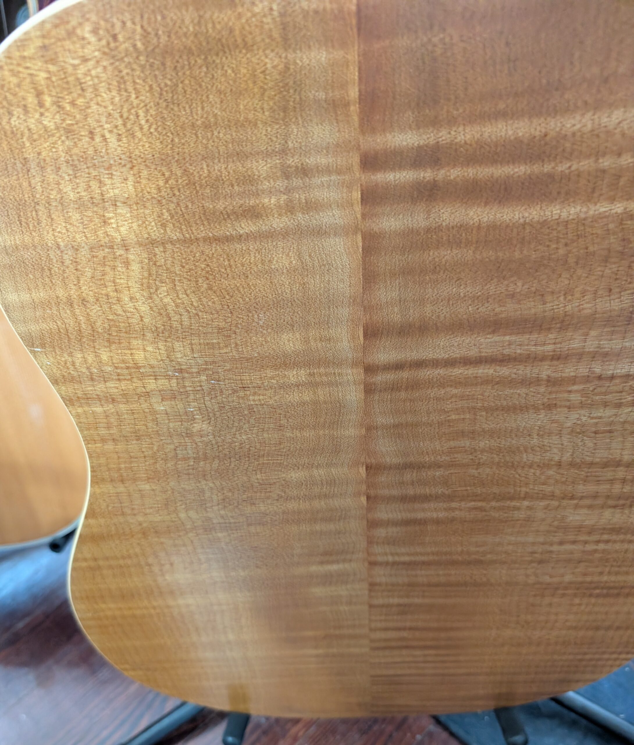 This is exquisite. The nut width is 2″. The scale length 24.5″. Square mahogany neck. Grover tuners. The case is a very cool vintage molded plastic with green lining.