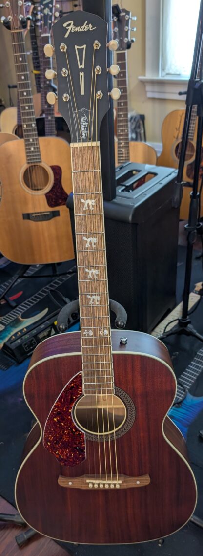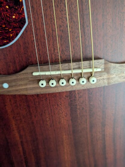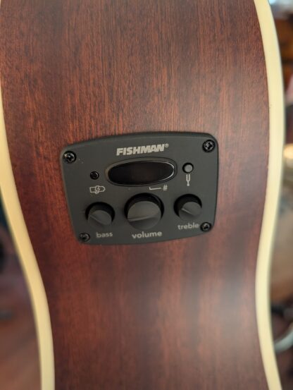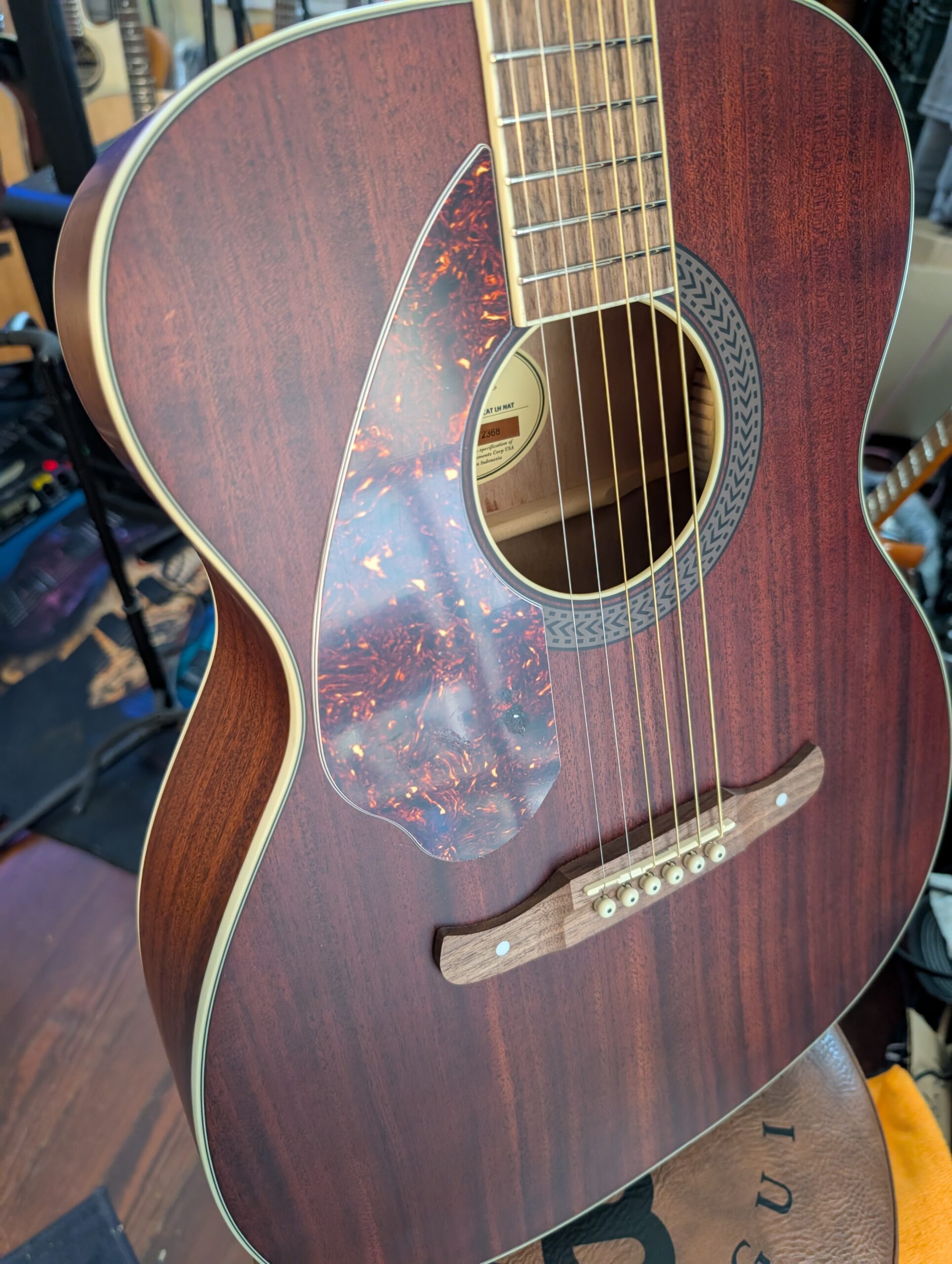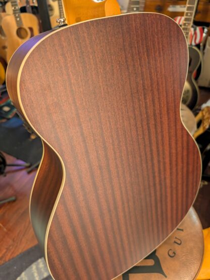 Solid mahogany top and laminated mahogany back and sides deliver warm, robust tone