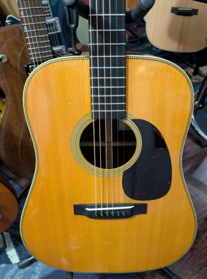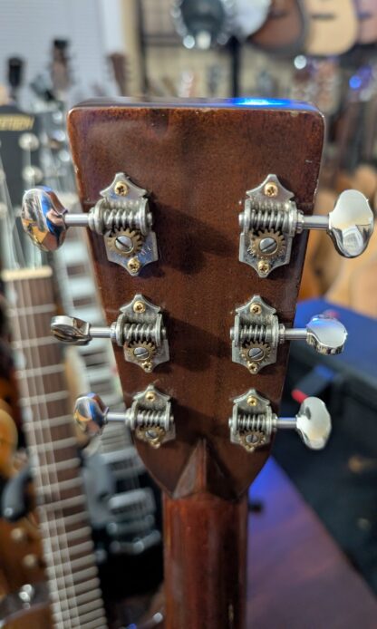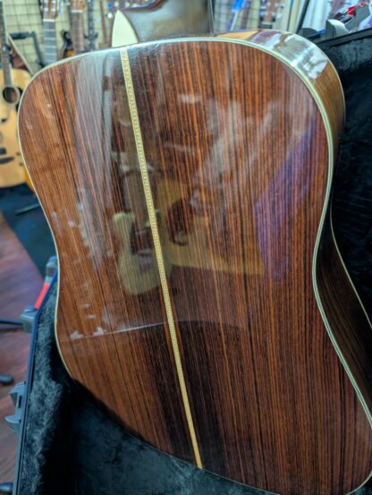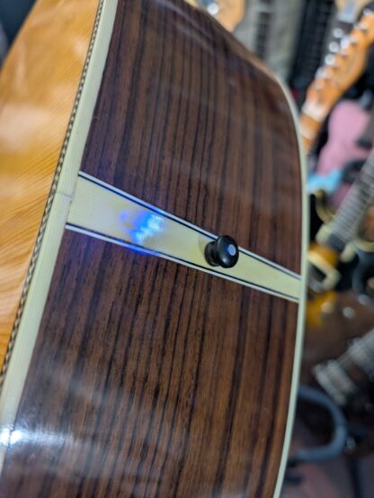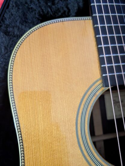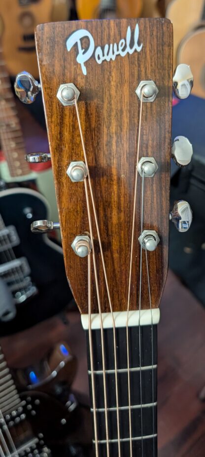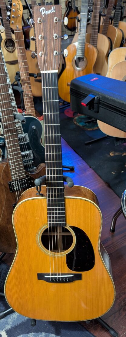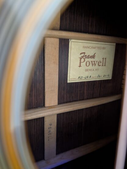 Frank Powell is a small batch builder from Berea Ky. It features solid Adirondack spruce top, solid rosewood back and sides. Herringbone binding. 1 3/4″ nut width, 25″ scale length. Hard shell case.