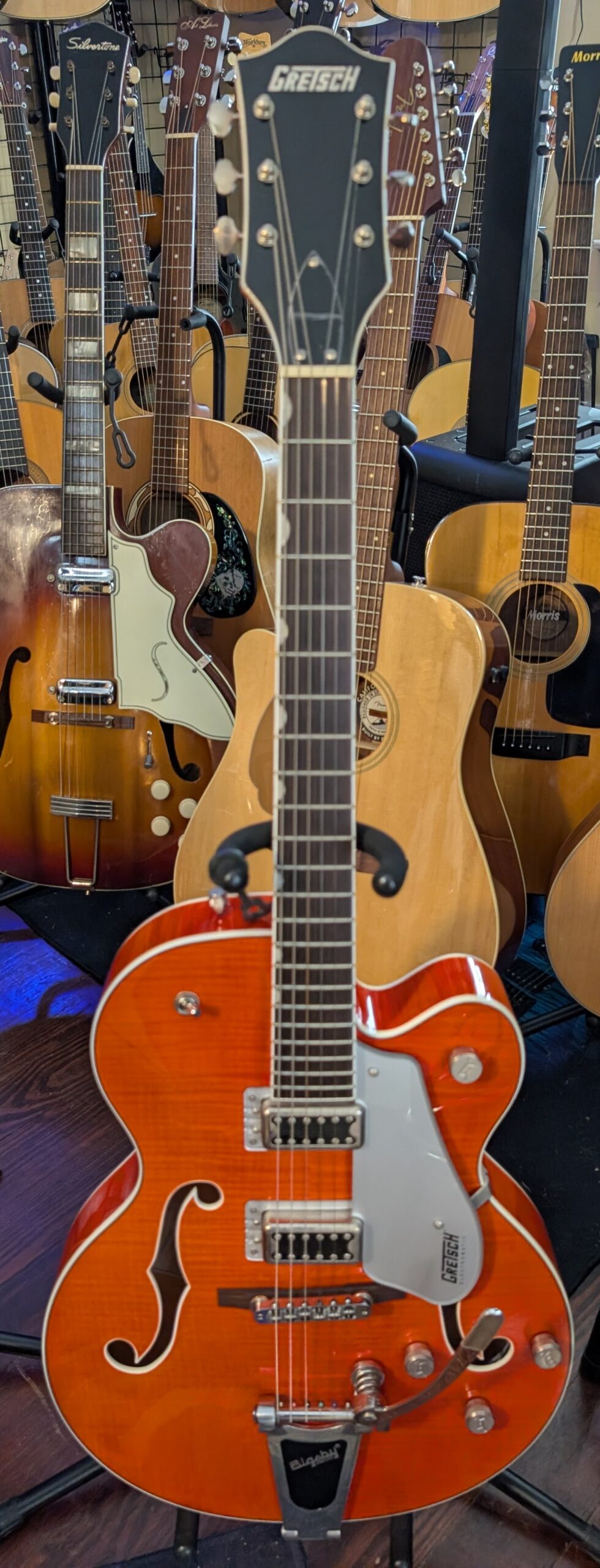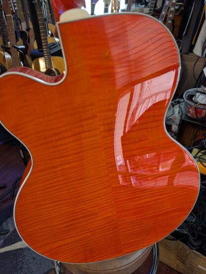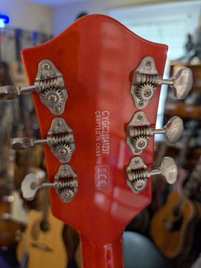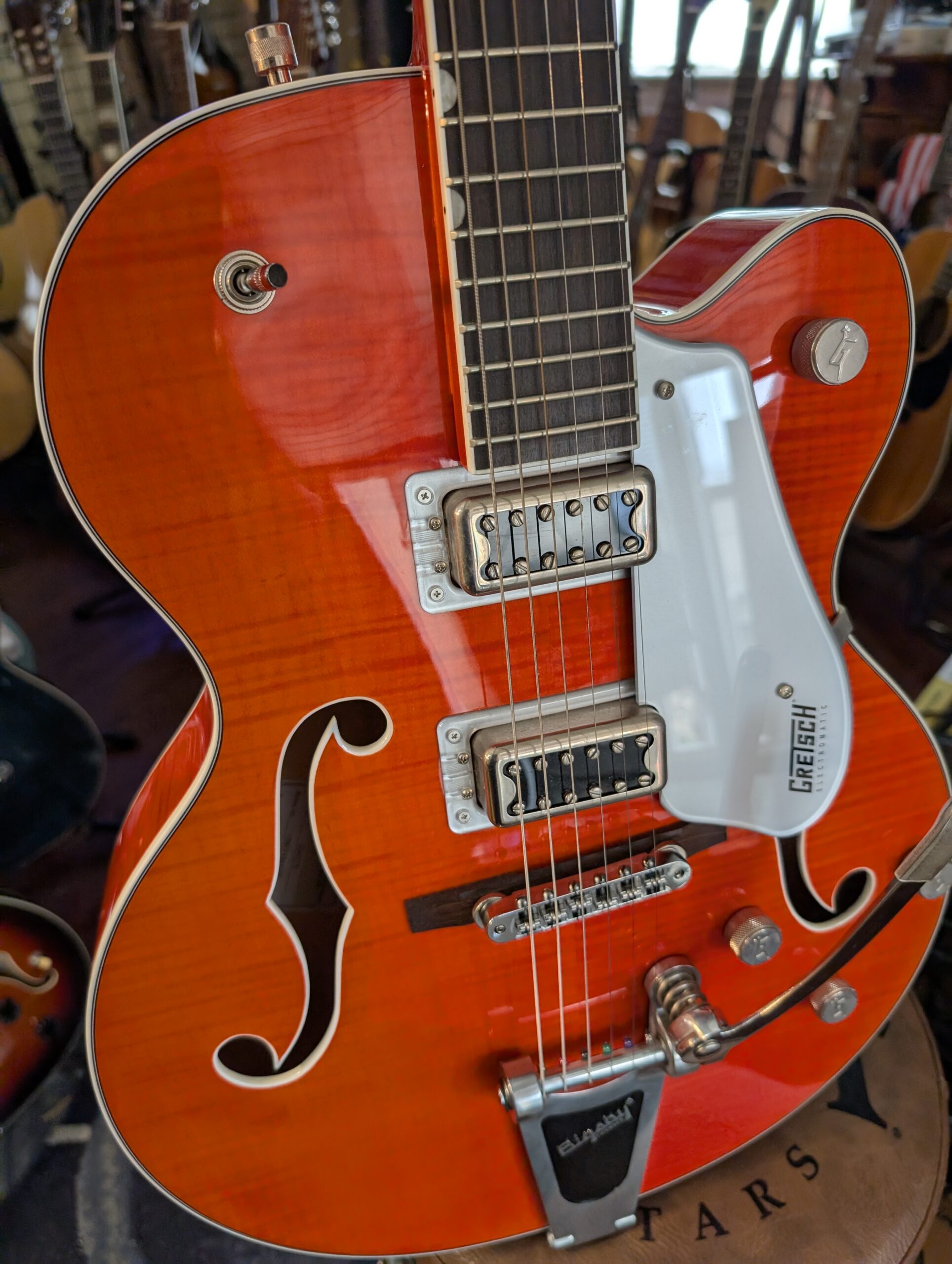 The Gretsch G5427T is an Electromatic hollow-body single-cut guitar featuring a laminated maple top and body, a maple neck, and a laurel fingerboard with “thumbnail” inlays. It has two FT-5E Filter’Tron humbucker pickups, a Bigsby B60 vibrato tailpiece, and versatile controls including individual volume knobs, a master volume, and a master tone.