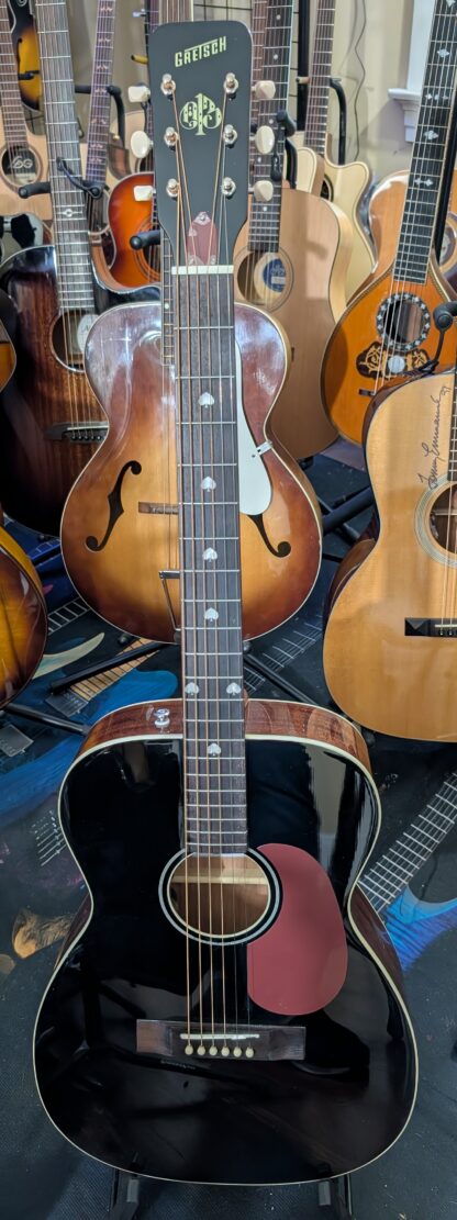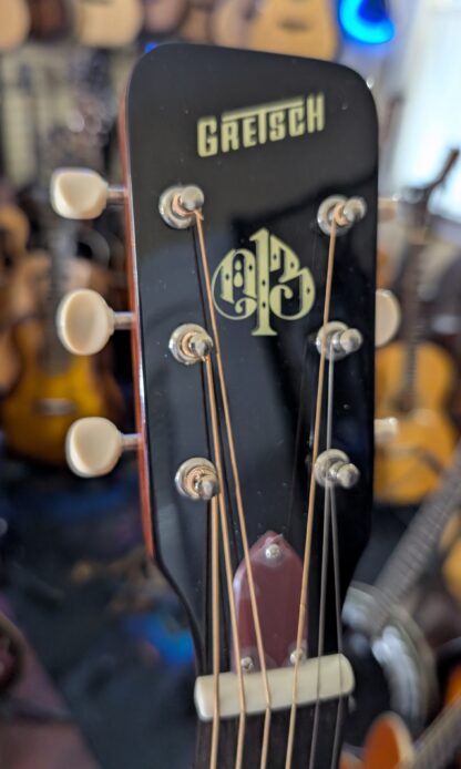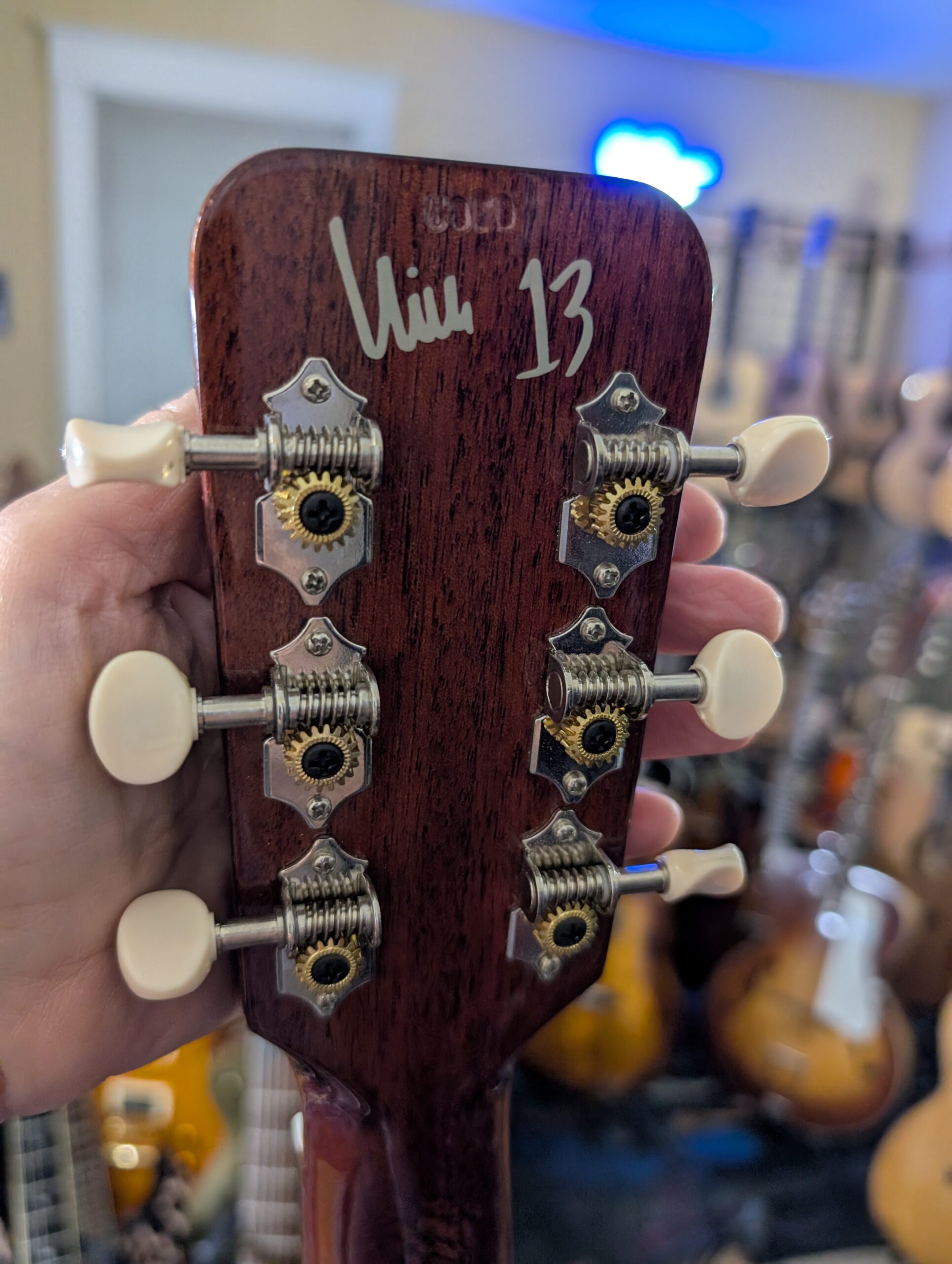 White button open-gear tuning machines offer a lovely vintage look that completely matches the energy of the rest of the guitar