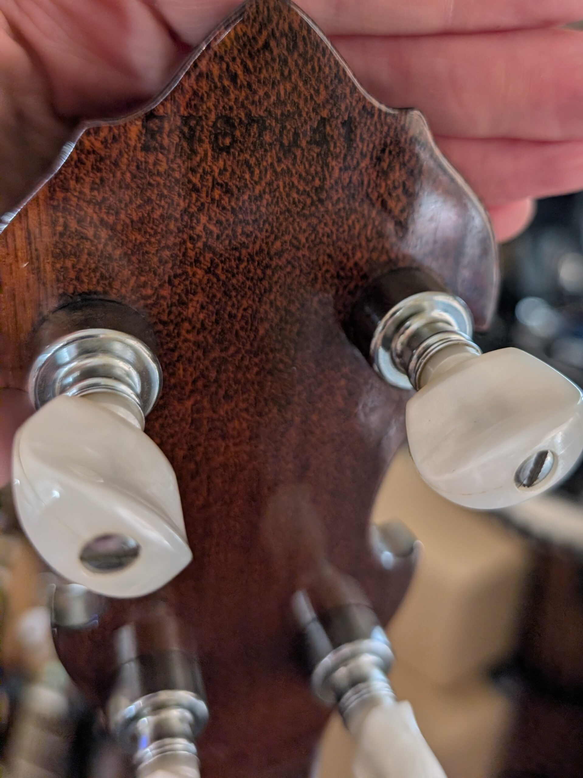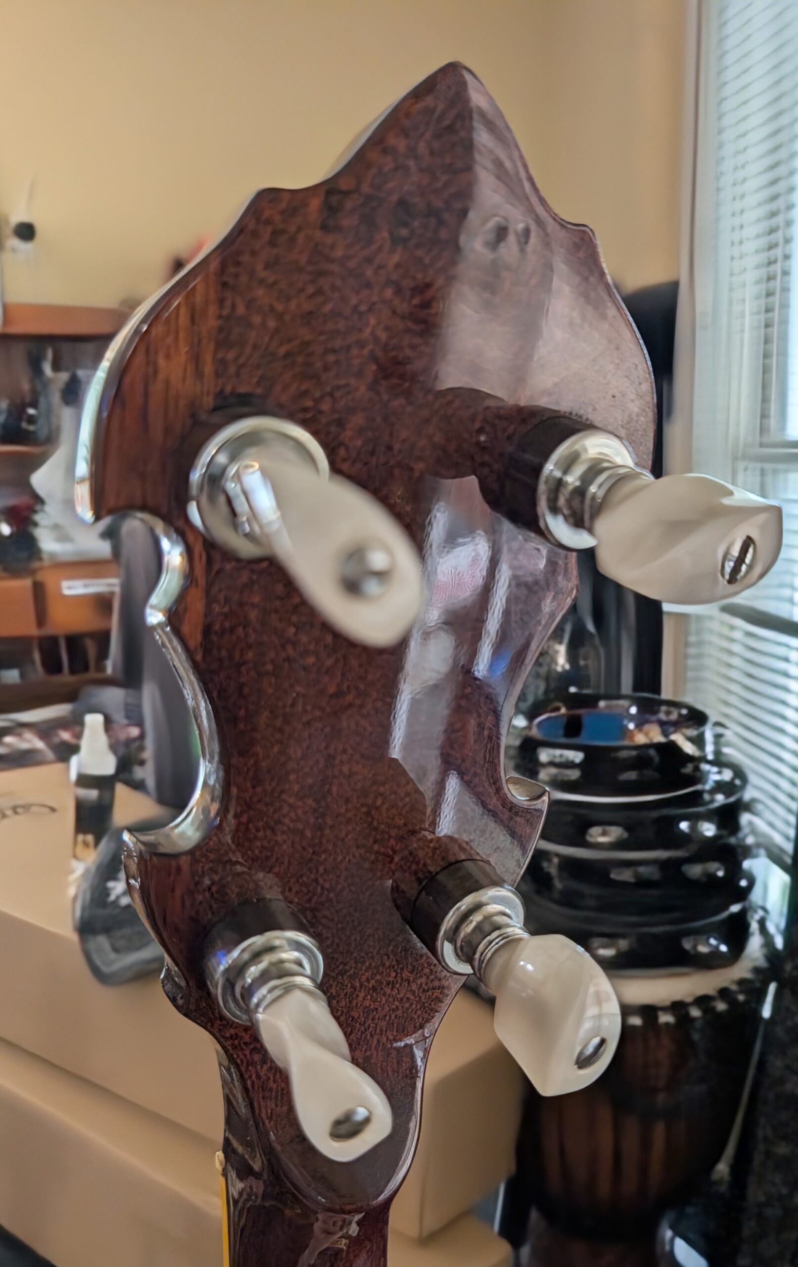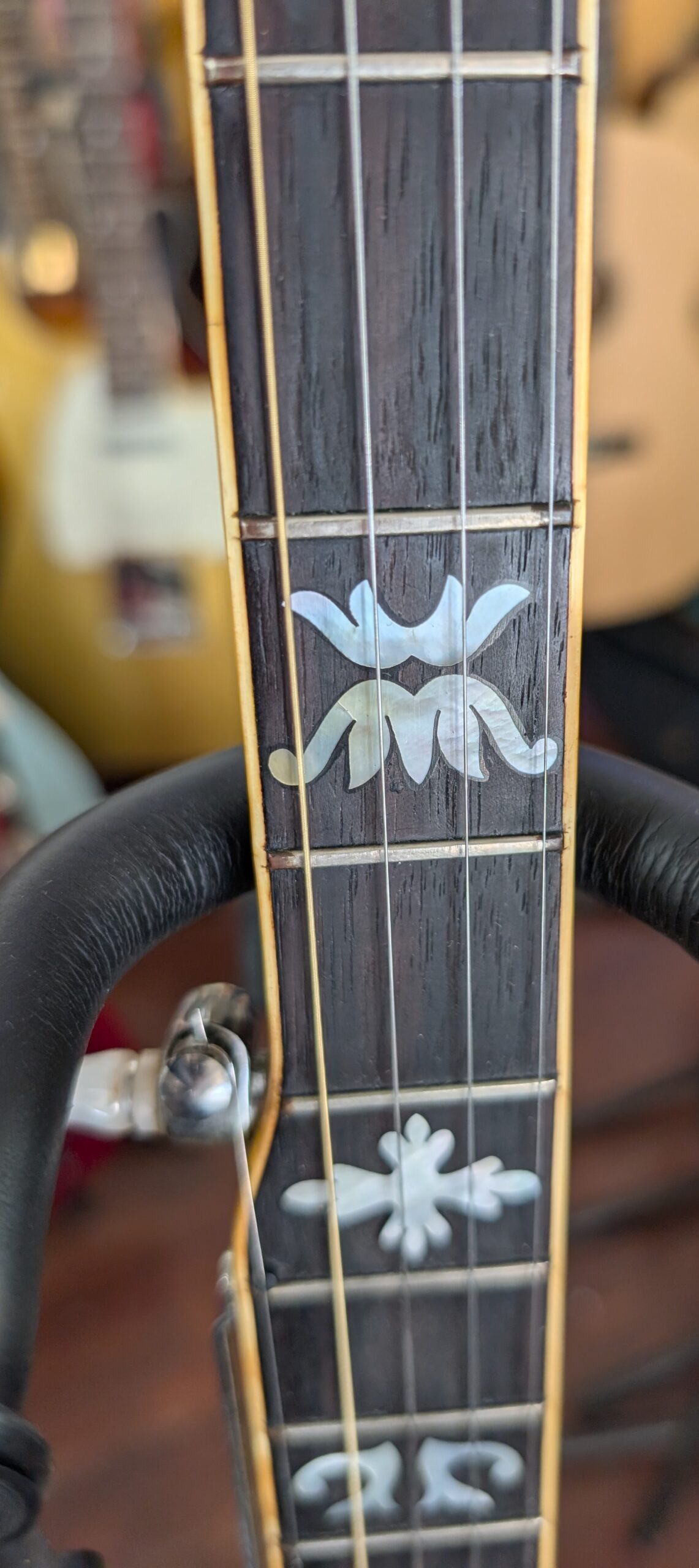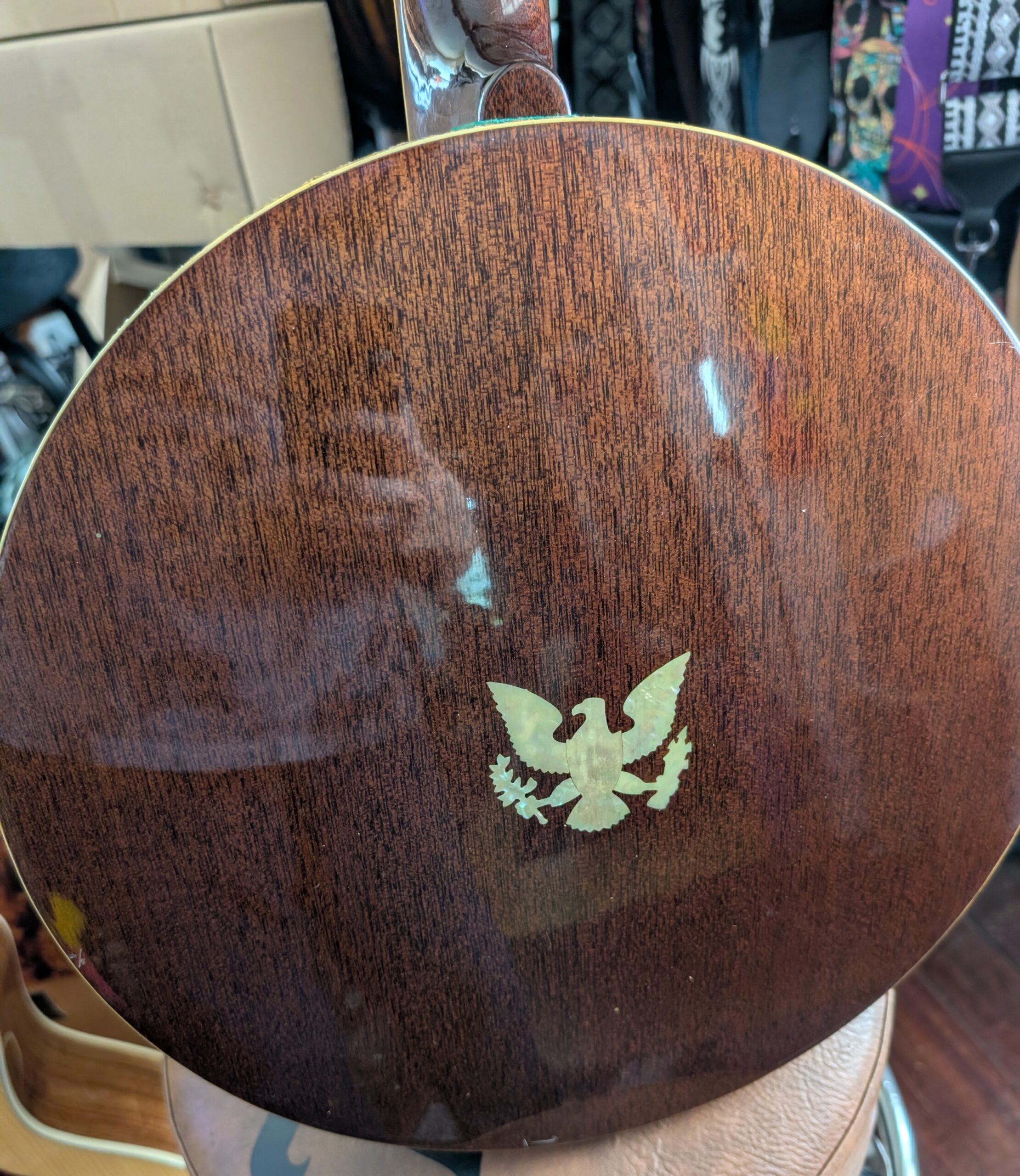 This is a high-quality, vintage resonator banjo. At some point in time someone thought it would be a good idea to “customize” it with glitter. I am not a fan but feel it might be hard on the finish to try to remove it. I was able to remove it from the end piece. New Ernie Ball Earthwood strings. Chipboard case.