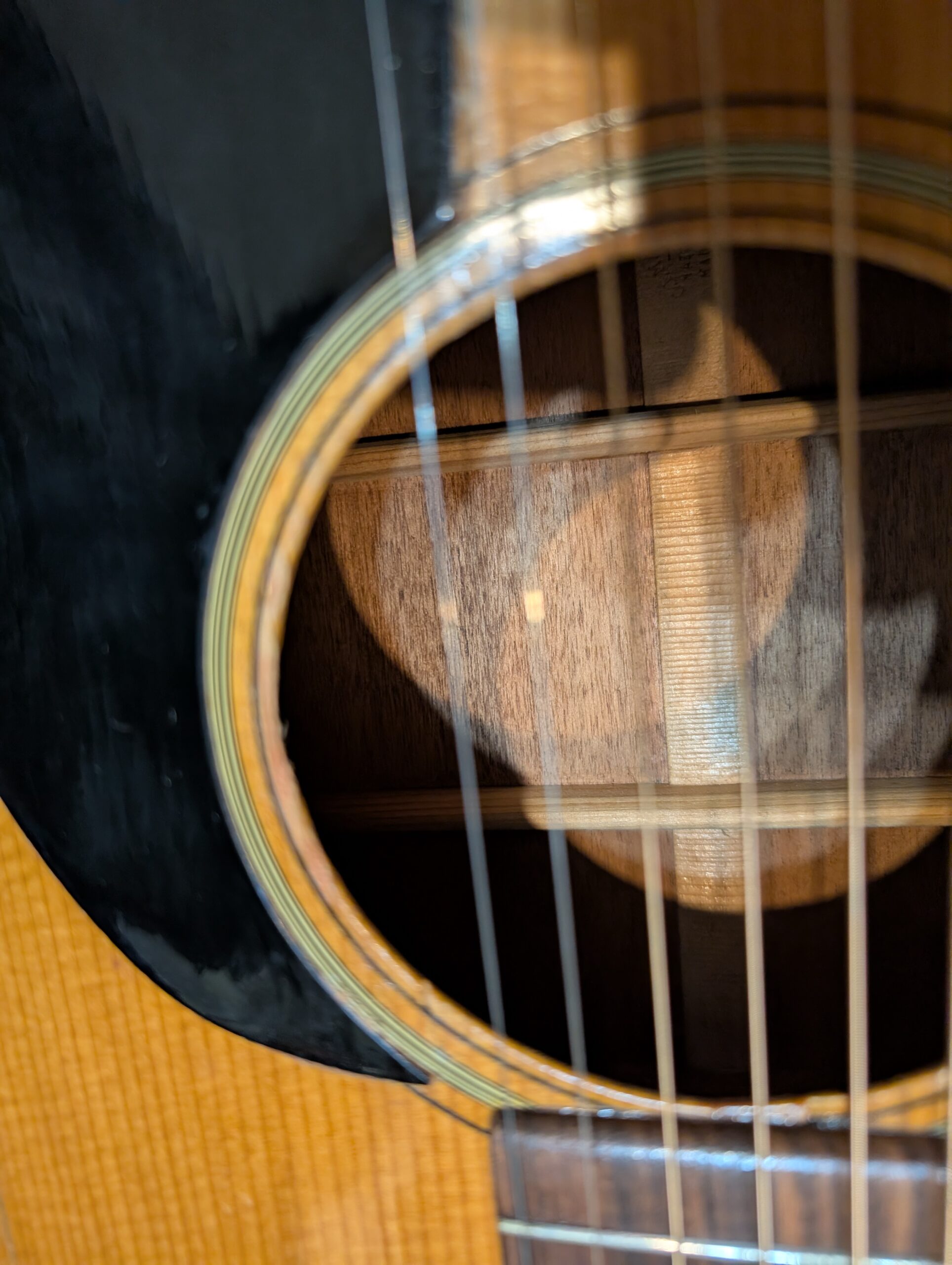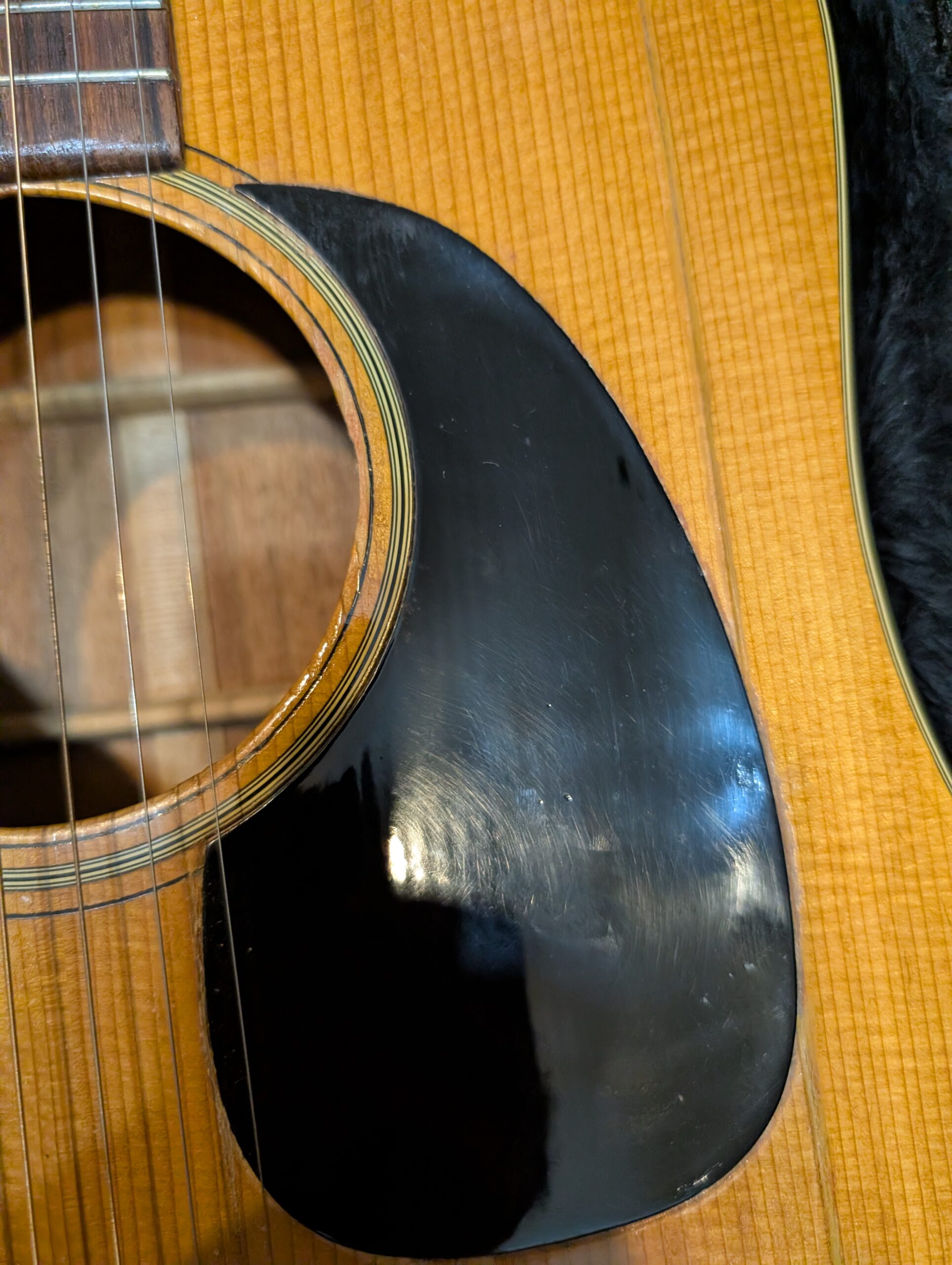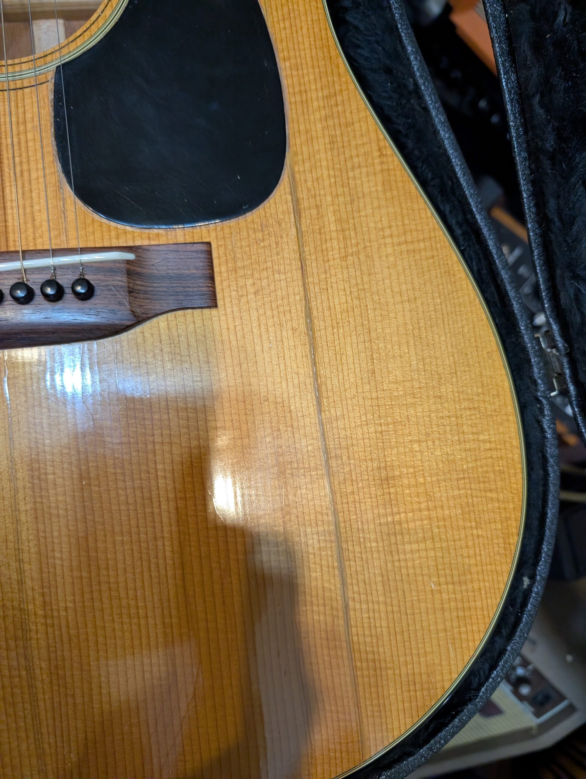 This guitar has it all. Booming sound, recent neck reset. Perfect action. Hardshell case. It is 53 years old and has had cracks repaired in the Adirondack spruce top. Solid mahogany back and sides. 25″ scale