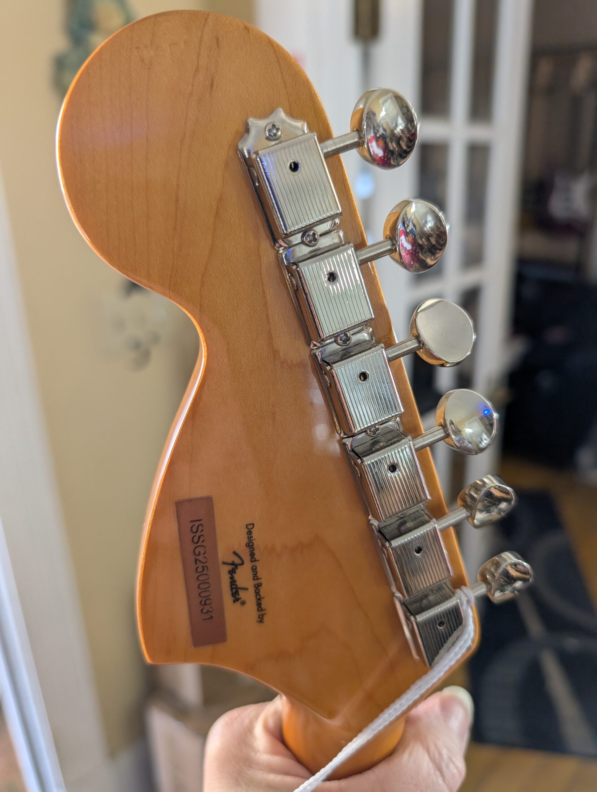 - Nickel hardware includes vintage-style tremolo bridge and tuning machines